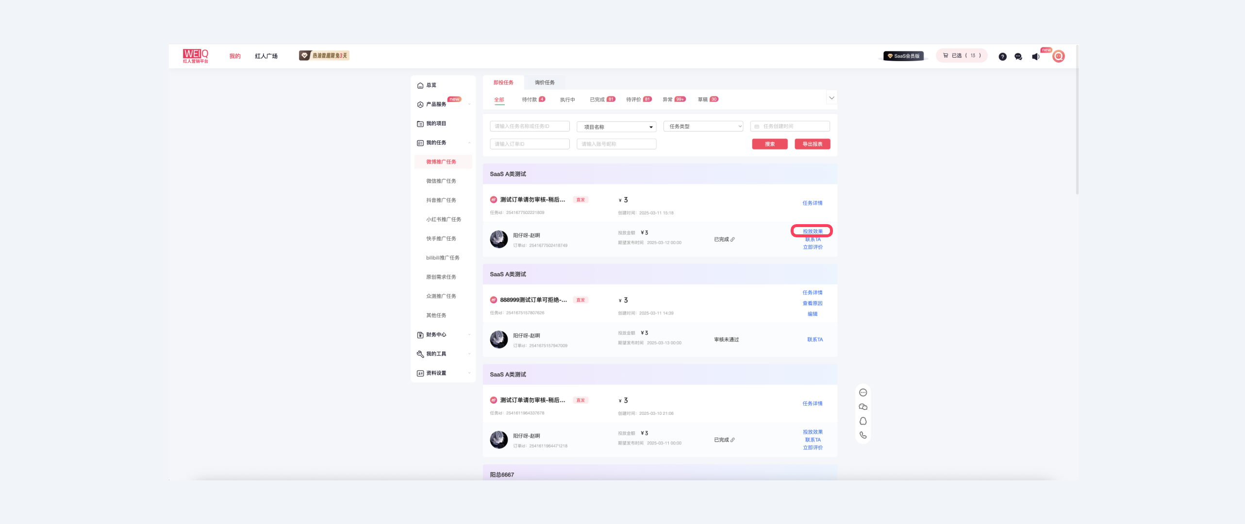 可以在“产品服务”我的任务中,查找相应任务订单,点击后方“投放效果”查看该订单的传播数据情况。