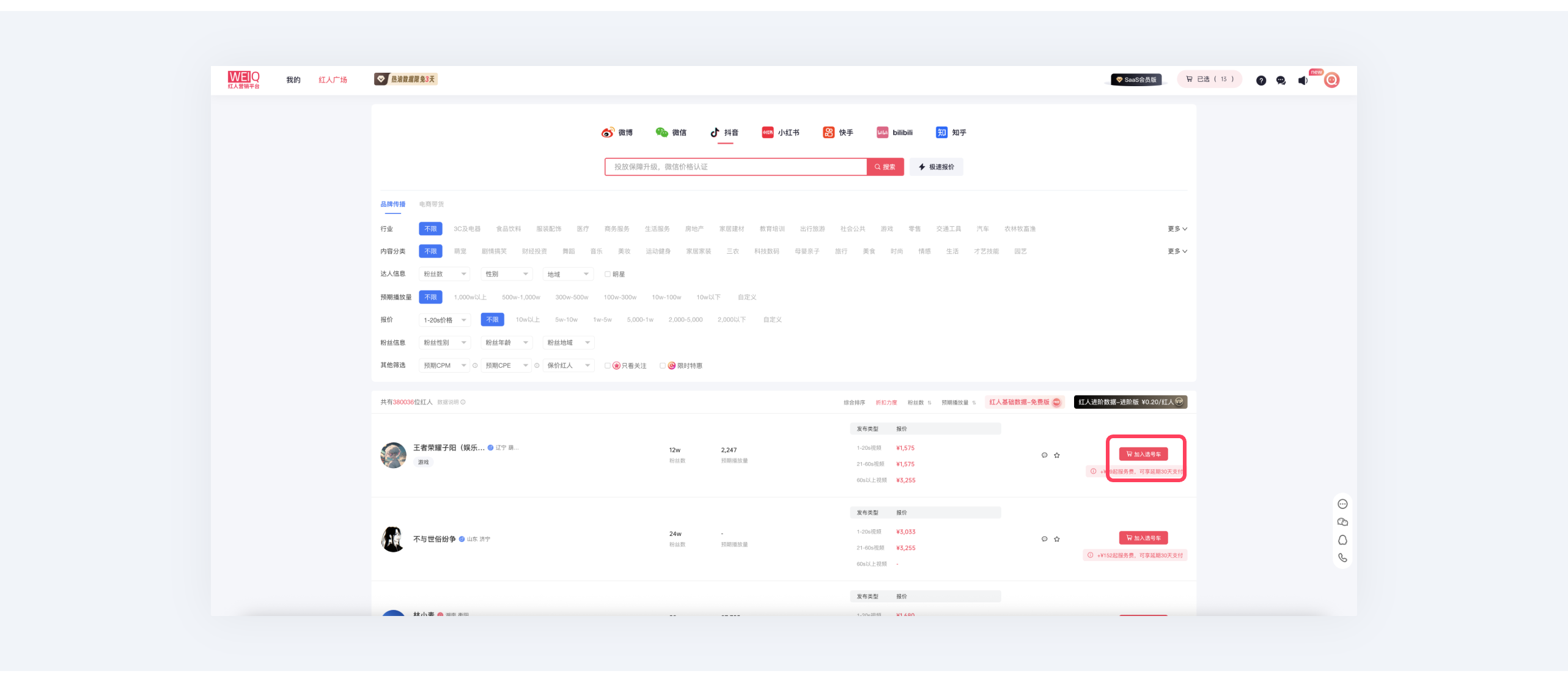 第一步:进入广告主界面后,点击“产品服务”或”红人推广“中的“抖音推广”,查找或搜索心仪账号;