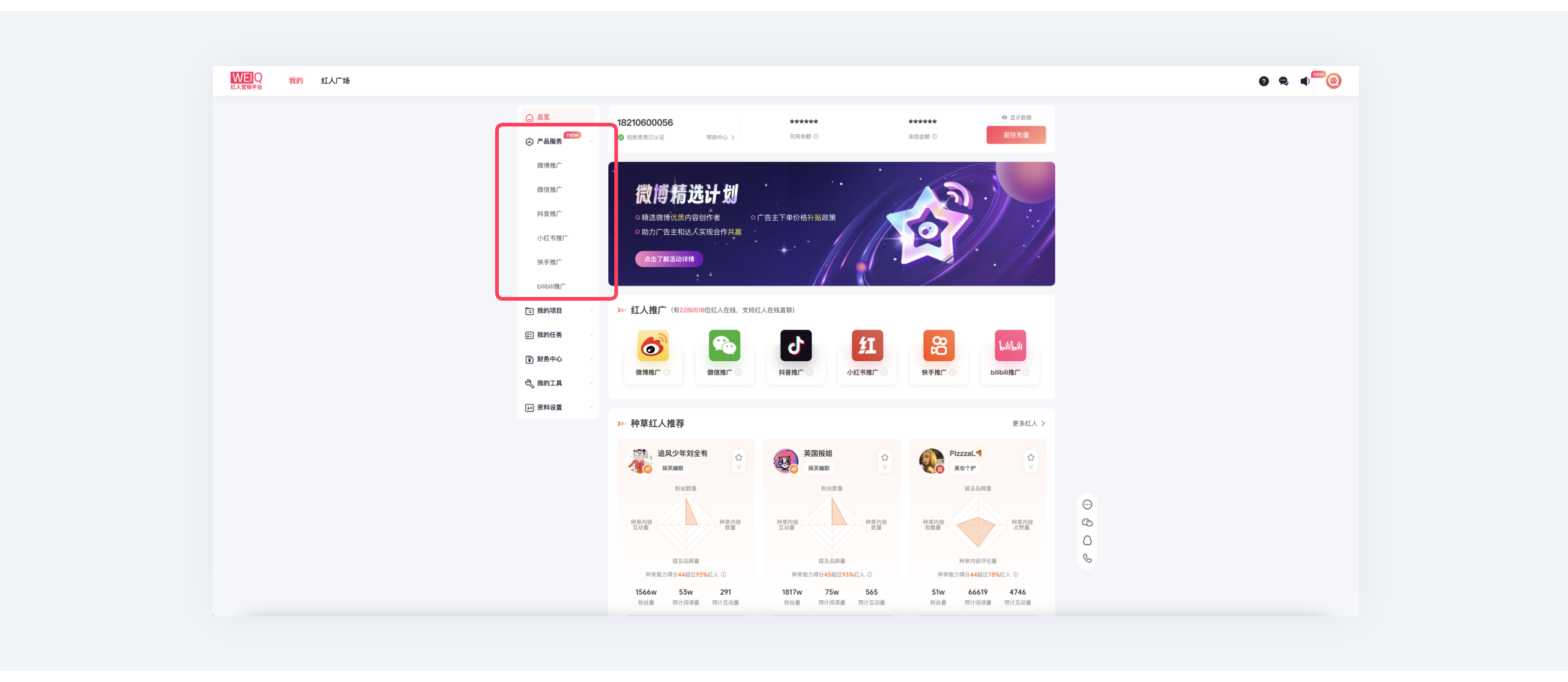 ③点击“产品服务”,可根据投放需求选择对应服务,目前提供微博、微信、抖音、小红书、快手、bilibilii等全链平台投放服务;