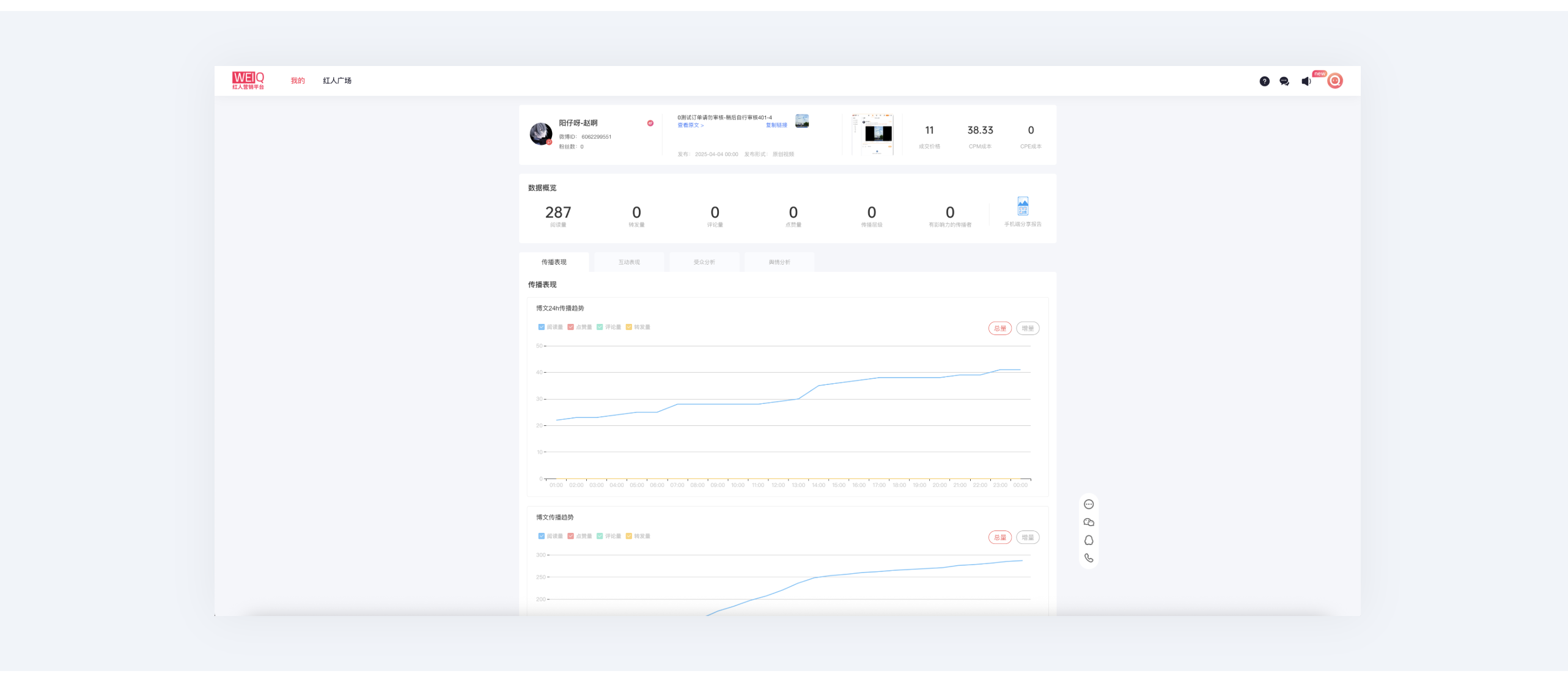 ⑥ 对于已投放结束的项目,可在“我的任务”中,查看相应投放效果,获得数据概览、传播表现、互动表现、受众分析及舆情分析。