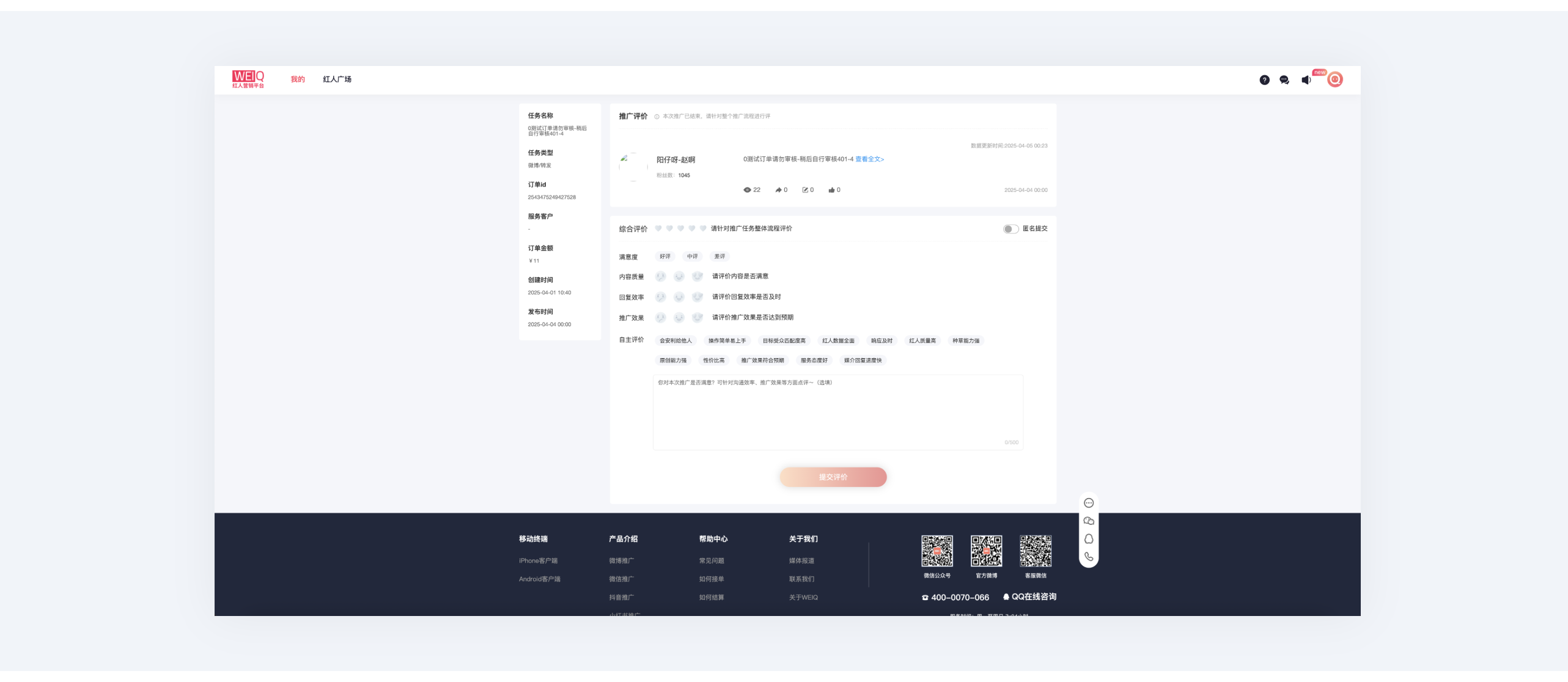 同时还可以点击“立即评价”,对该订单进行内容质量、回复效率、推广效果方面的评价。