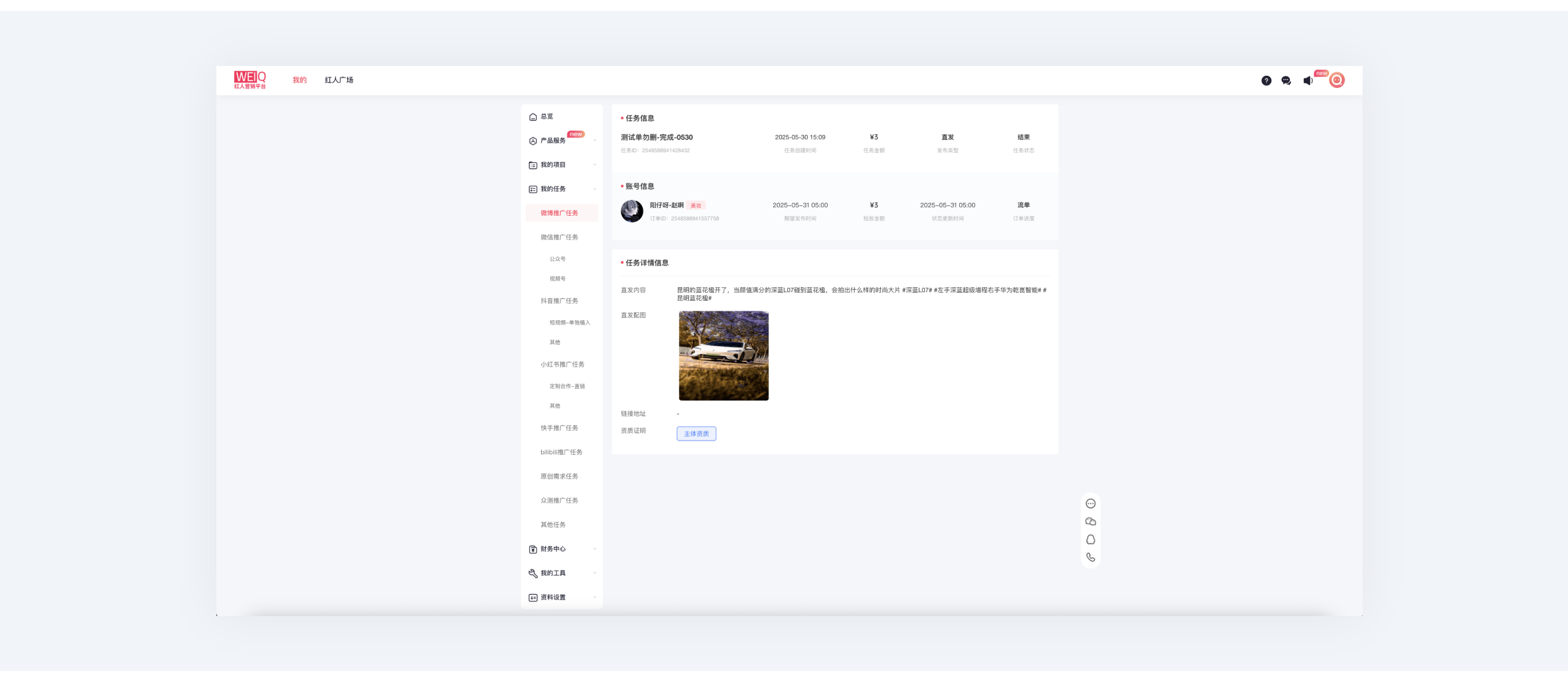 ⑤ 在每项任务中都可点击“任务详情”查看任务类型、任务账号、发布时间、发布内容、及资质证明等信息。