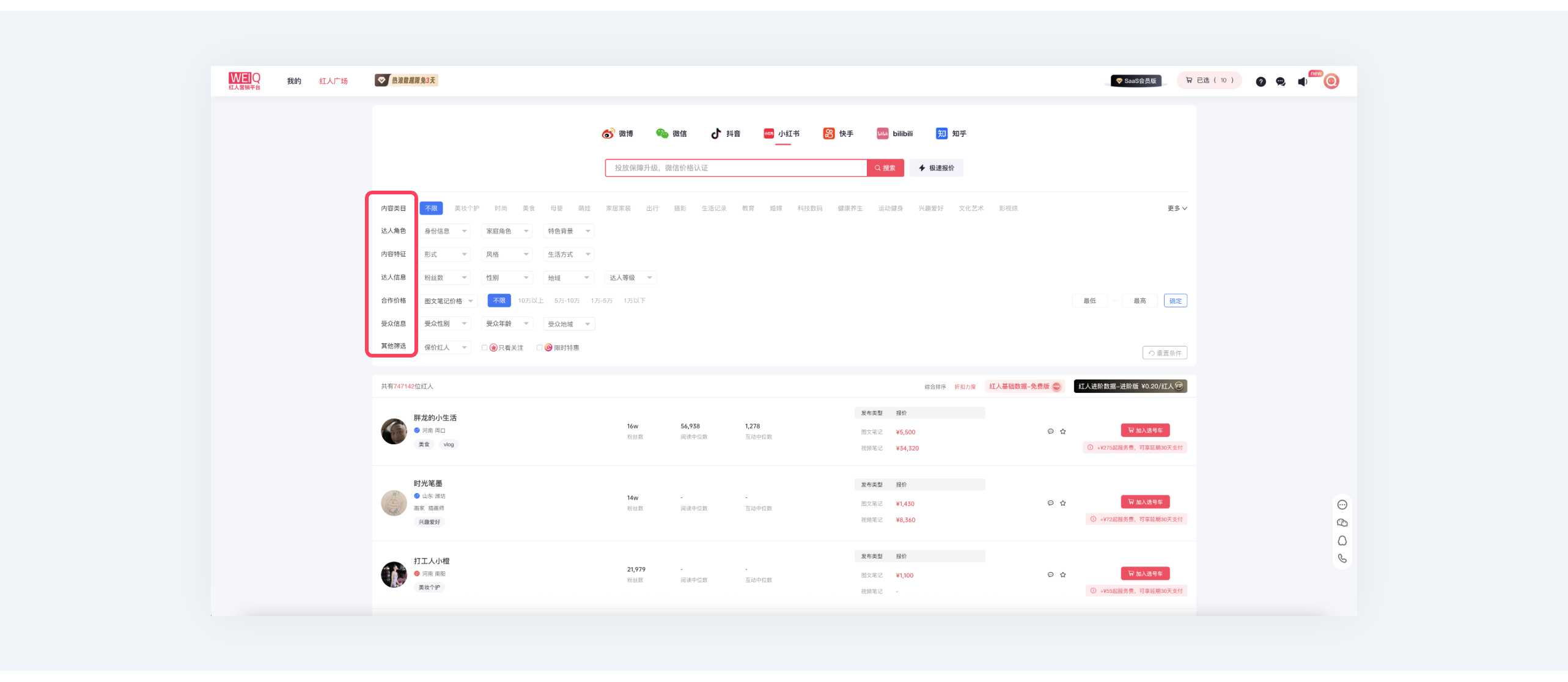 第一步:进入广告主界面后,点击“产品服务”或“红人推广”中的“小红书推广”,查找或搜索心仪账号;
