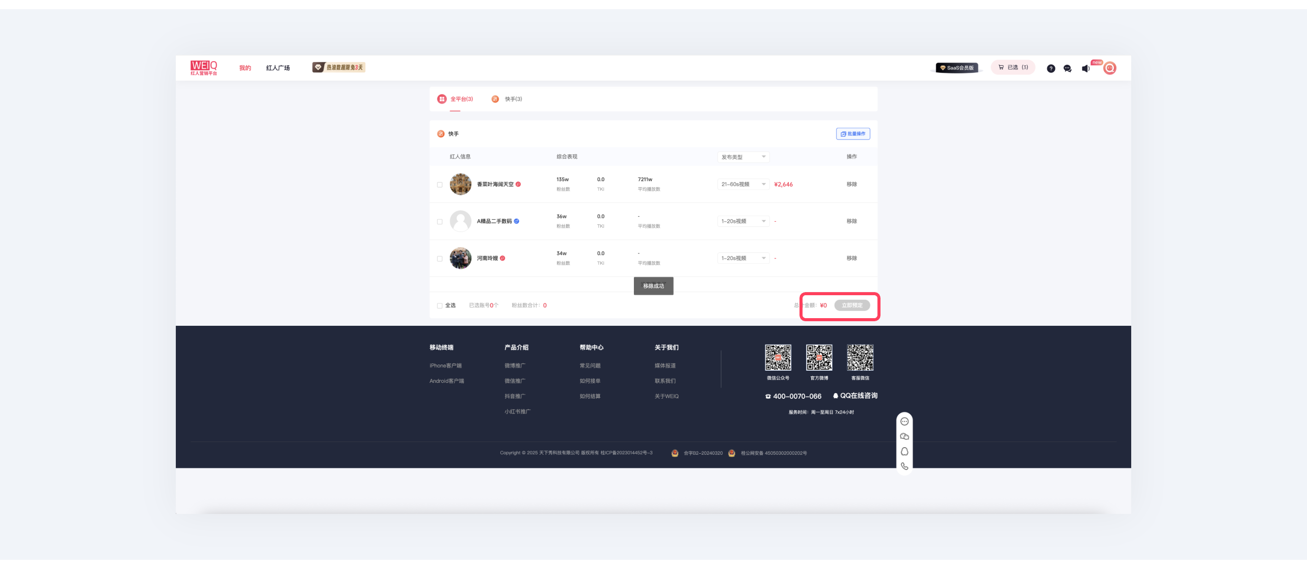 第一步:进入广告主界面后,点击“产品服务”或“红人推广”中的“快手推广”,查找或搜索心仪账号;